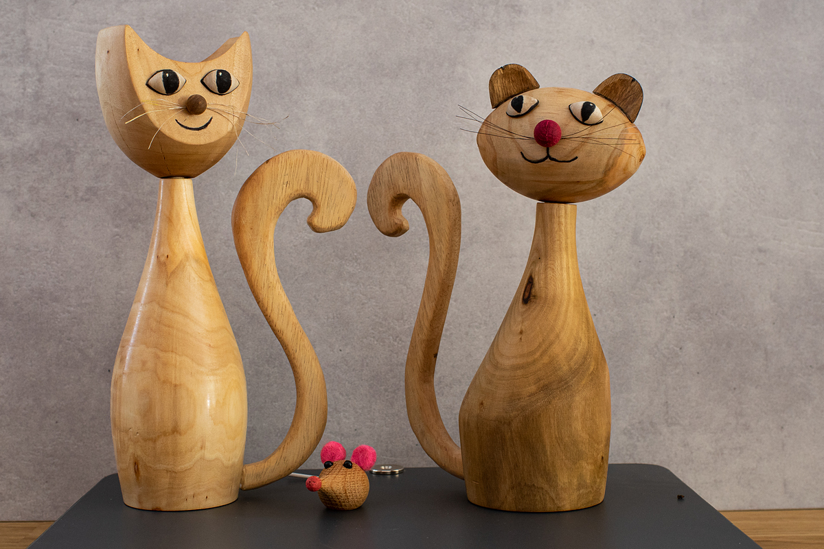 Miezekatzen .... schnurrrrr .... (Nur zur Info .... die nachfolgenden Bilder veranschaulichen nur, wie meine Katzen nach dem Drechseln ungefähr aussehen. Jede wird anders werden, da ich NIE das selbe Holz habe. Ich drechsel halt aus dem Bauch raus nach Gefühl und nicht nach Maß. Köpfe, Ohren, Augen und Nase sind i.d.R. noch nicht festgeklebt. Es besteht die Möglichkeit diese somit vor Ort bei mir zu wechseln / tauschen. )